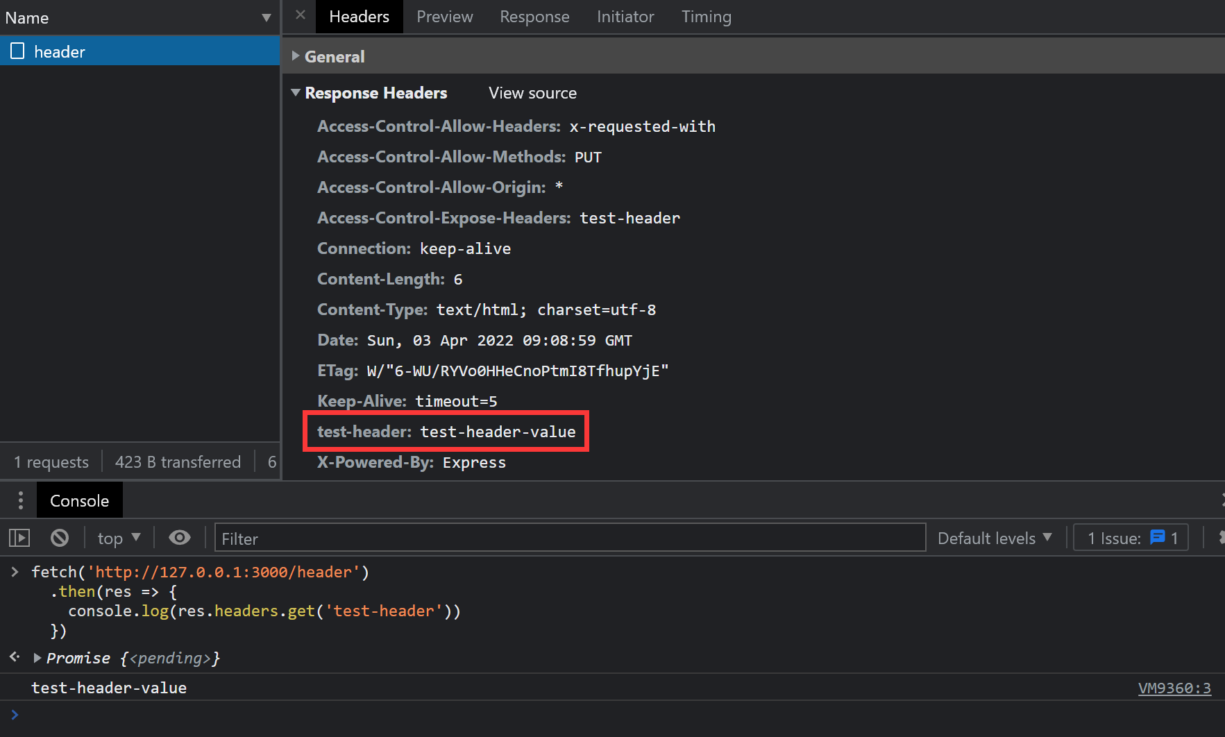 fetch('http://127.0.0.1:3000/header') .then(res => { console.log(res.headers.get('test-header')) })结果如图: