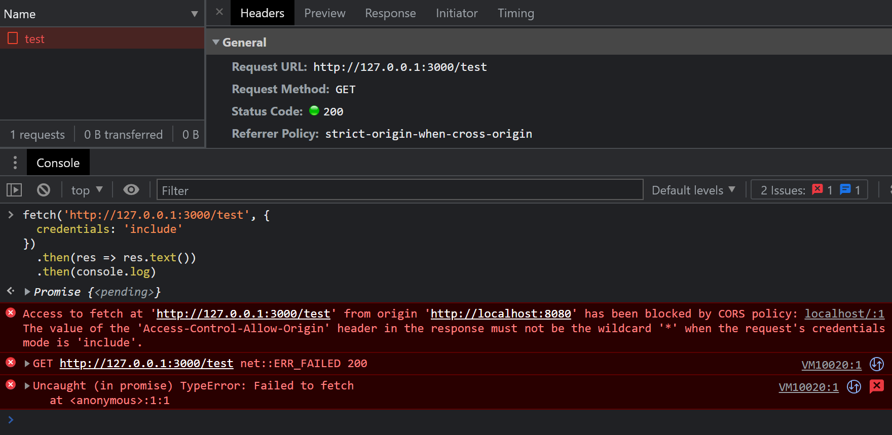 Access to fetch at 'http://127.0.0.1:3000/test' from origin 'http://localhost:8080' has been blocked by CORS policy: The value of the 'Access-Control-Allow-Origin' header in the response must not be the wildcard '*' when the request's credentials mode is 'include'.从错误中,可以知道,在 credentials 模式为 include 的时候,之前设置的 Access-Control-Allow-Origin 头就不能简单粗暴的设为 * 了。