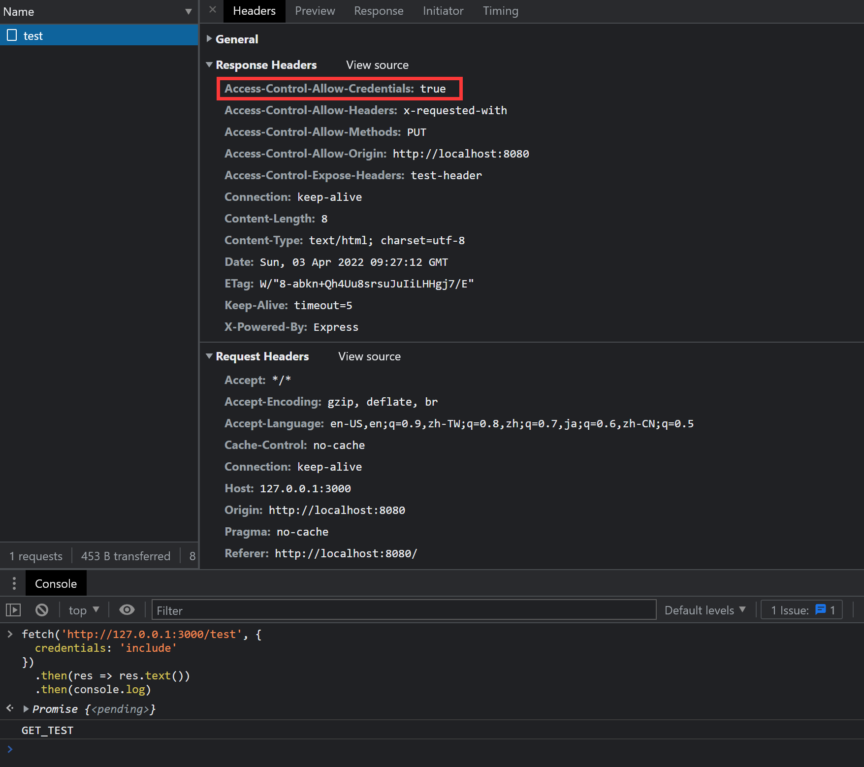 Access to fetch at 'http://127.0.0.1:3000/test' from origin 'http://localhost:8080' has been blocked by CORS policy: The value of the 'Access-Control-Allow-Credentials' header in the response is '' which must be 'true' when the request's credentials mode is 'include'.从错误中,我们知道,此时响应头还需要设置 Access-Control-Allow-Credentials ,将其值设置为 true(唯一合法值)。