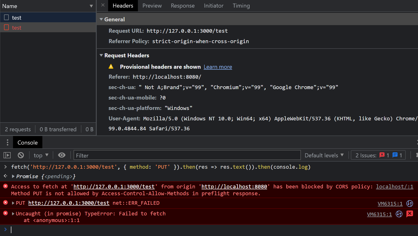 fetch('http://127.0.0.1:3000/test', { method: 'PUT' }) .then(res => res.text()) .then(console.log)网络面板中,可以观察到两个请求,其中一个是 OPTIONS 请求预检,一个失败的 PUT 请求: