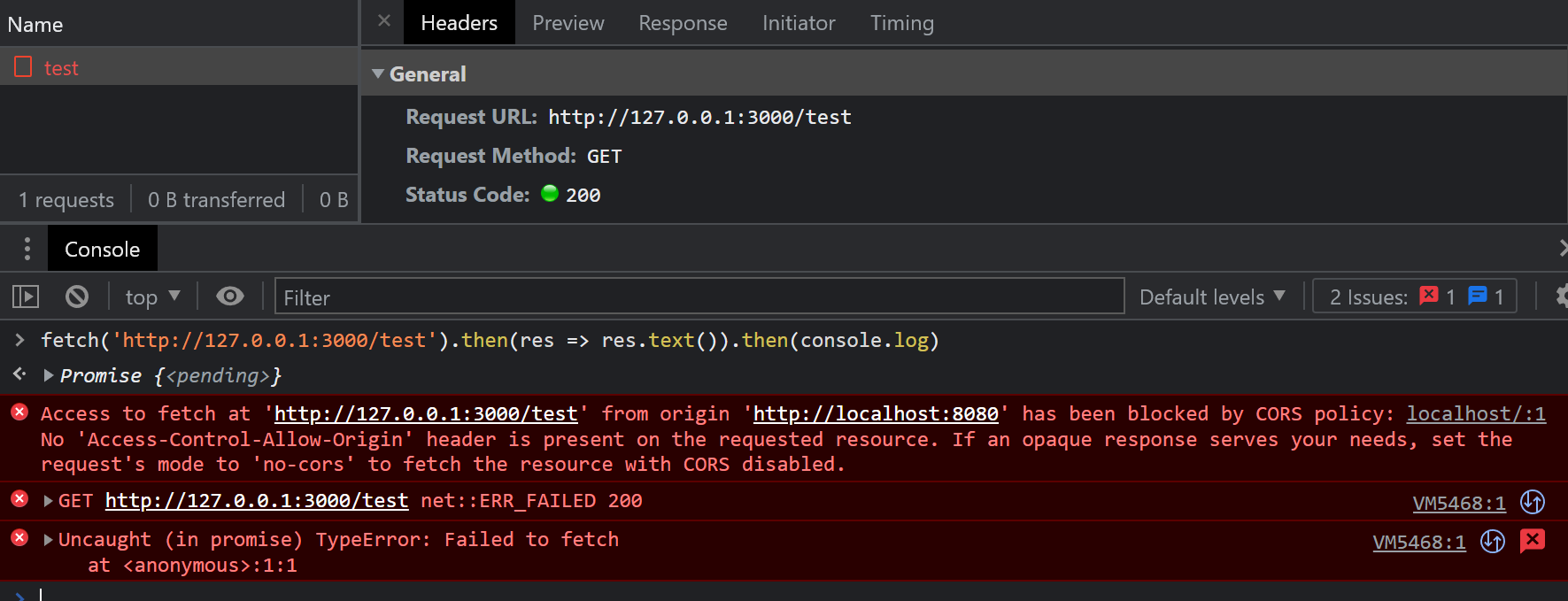 Access to fetch at 'http://127.0.0.1:3000/test' from origin 'http://localhost:8080' has been blocked by CORS policy: No 'Access-Control-Allow-Origin' header is present on the requested resource. If an opaque response serves your needs, set the request's mode to 'no-cors' to fetch the resource with CORS disabled.从这个错误提示中,我们也可以知道,问题的关键在于 Access-Control-Allow-Origin 头。这个头信息用于指明允许的 Origin,其值可以是通配符 *。我们改造下服务端代码: