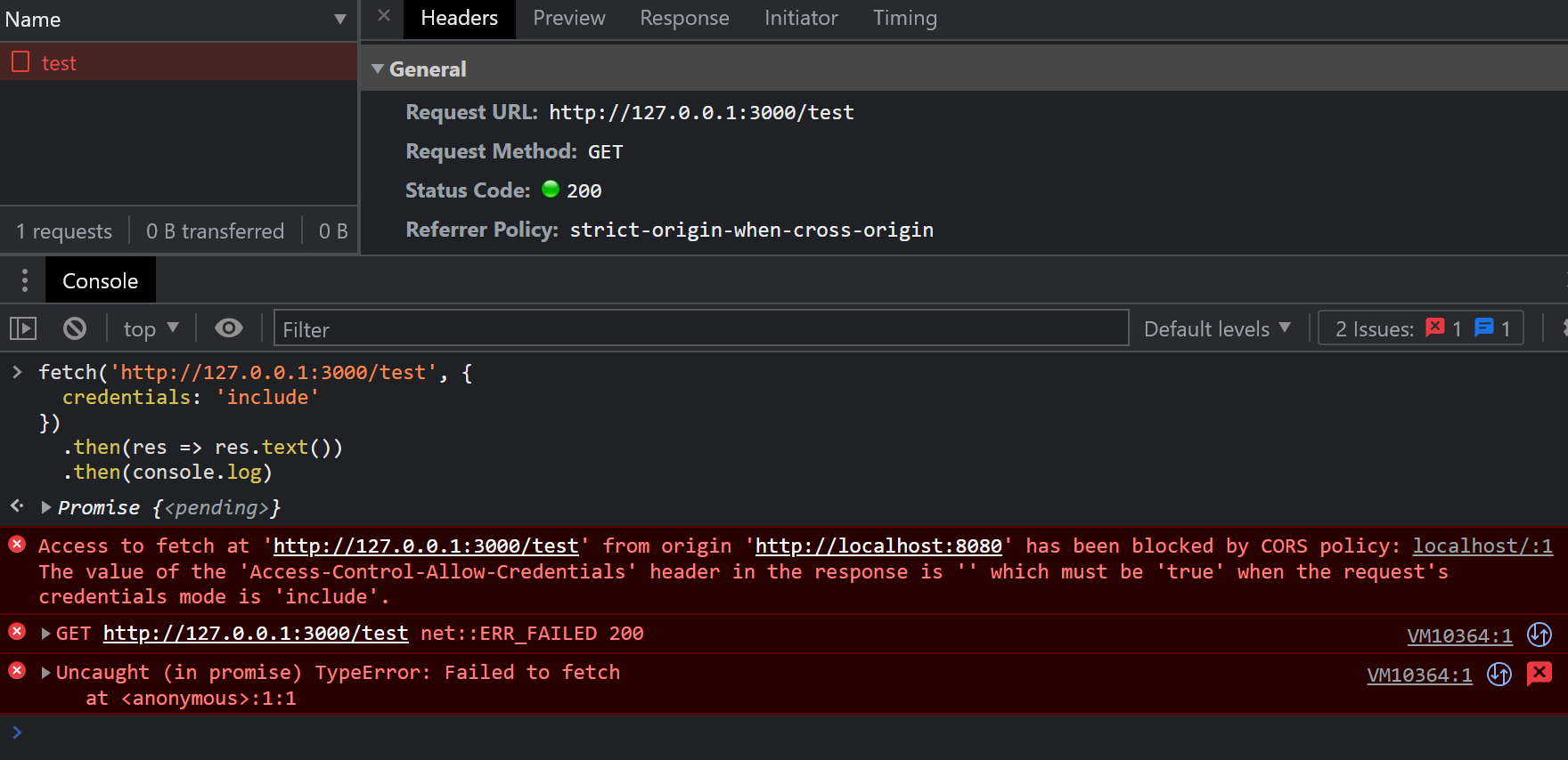 fetch('http://127.0.0.1:3000/test', { credentials: 'include'}) .then(res => res.text()) .then(console.log)注,如果用