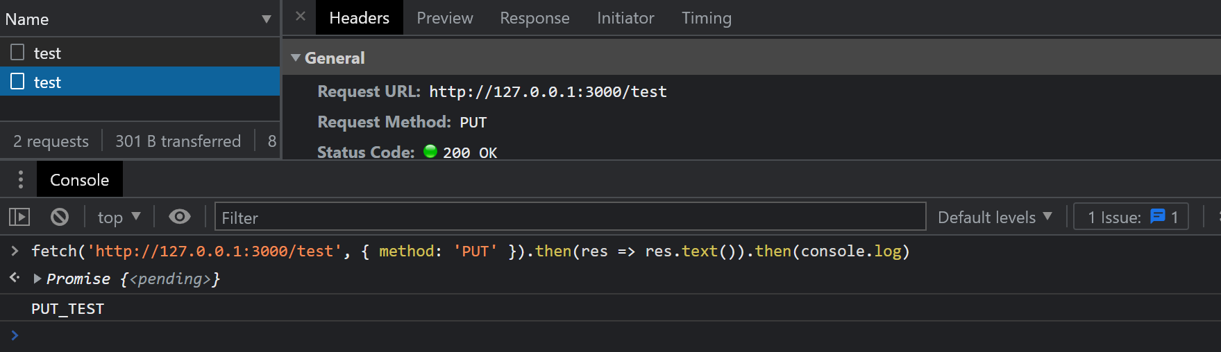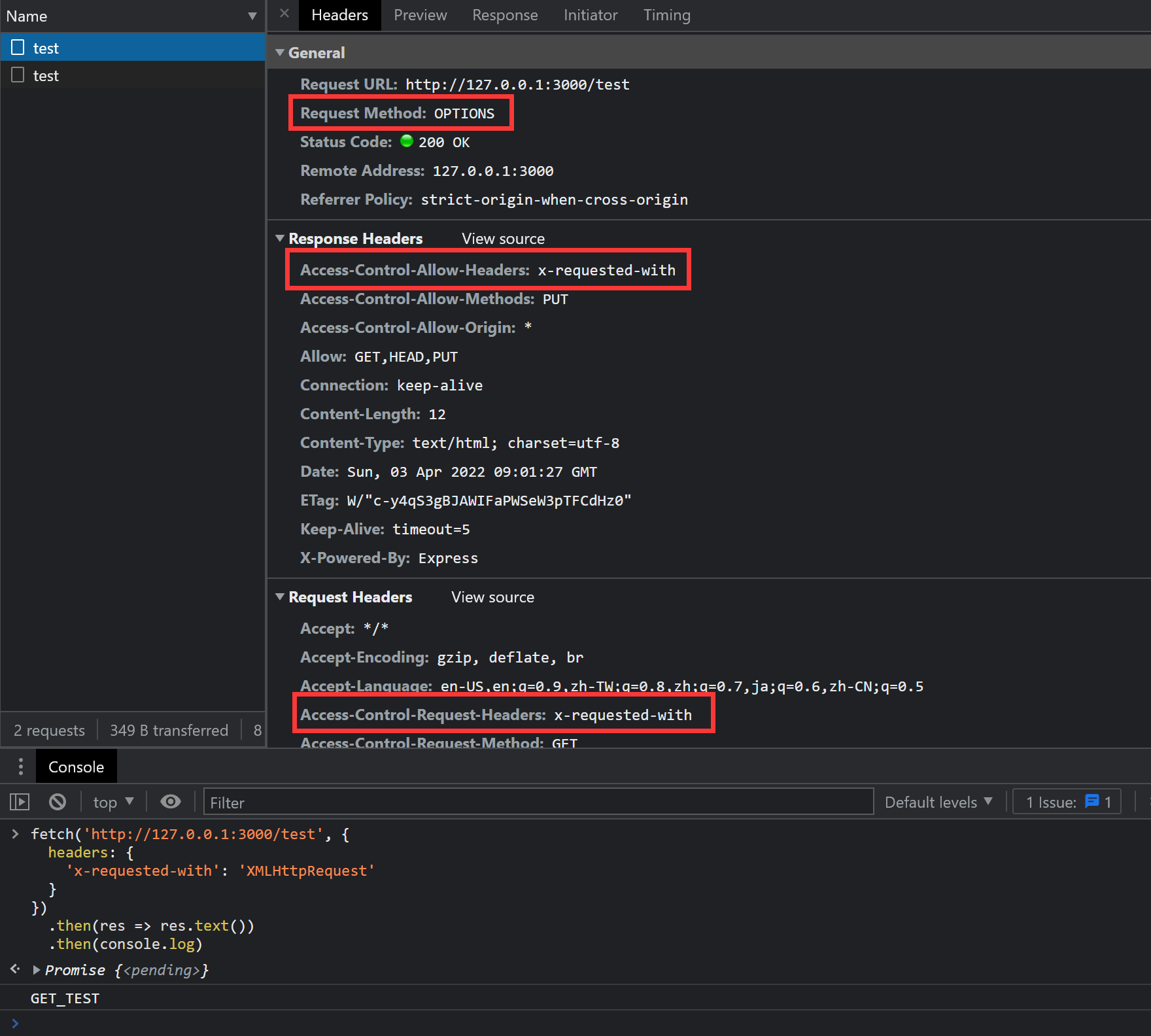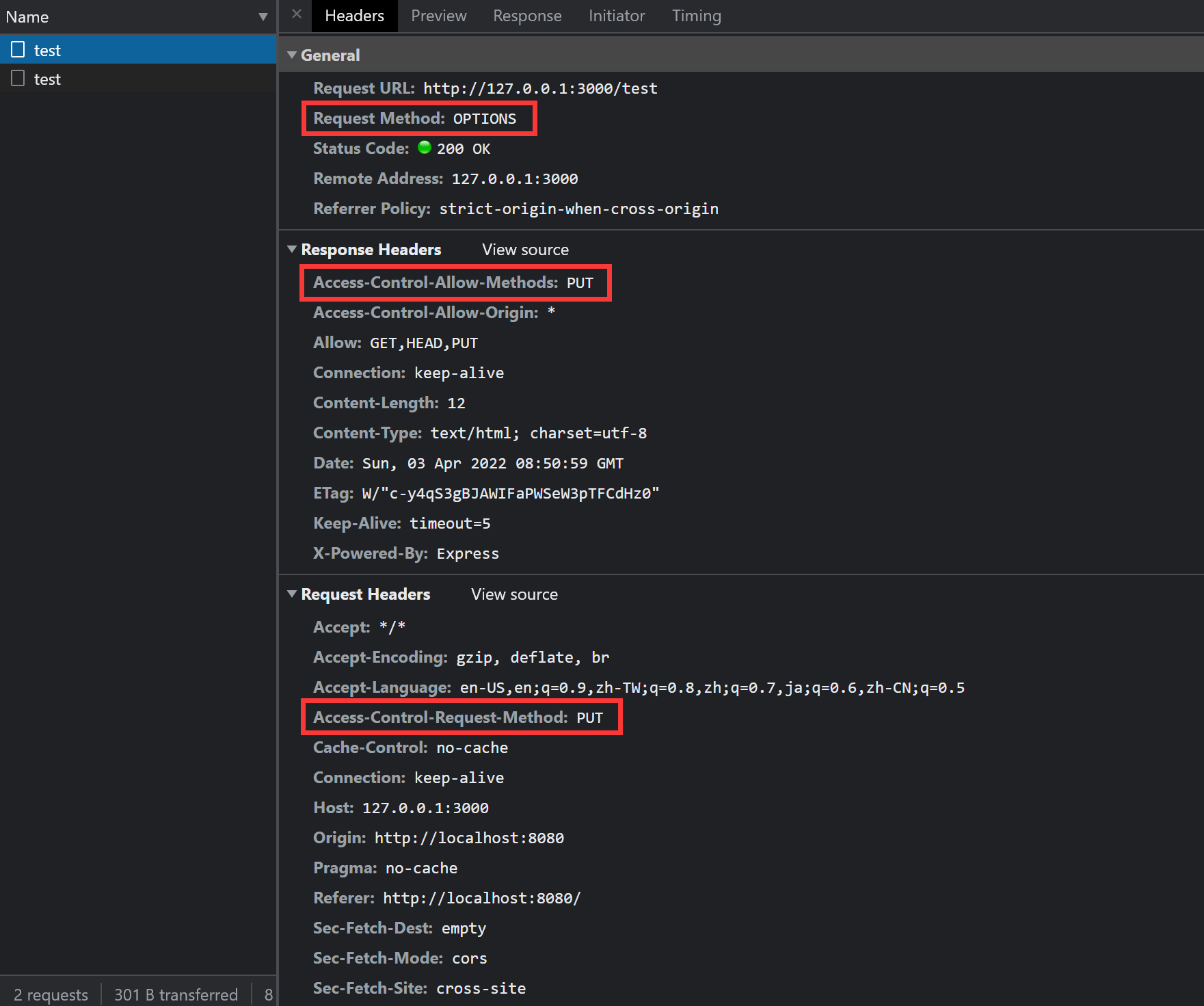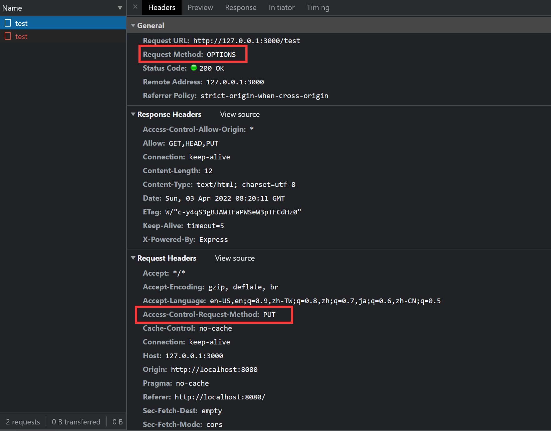 fetch('http://127.0.0.1:3000/test', { method: 'PUT' }) .then(res => res.text()) .then(console.log)网络面板中,可以观察到两个请求,其中一个是 OPTIONS 请求预检,一个失败的 PUT 请求: