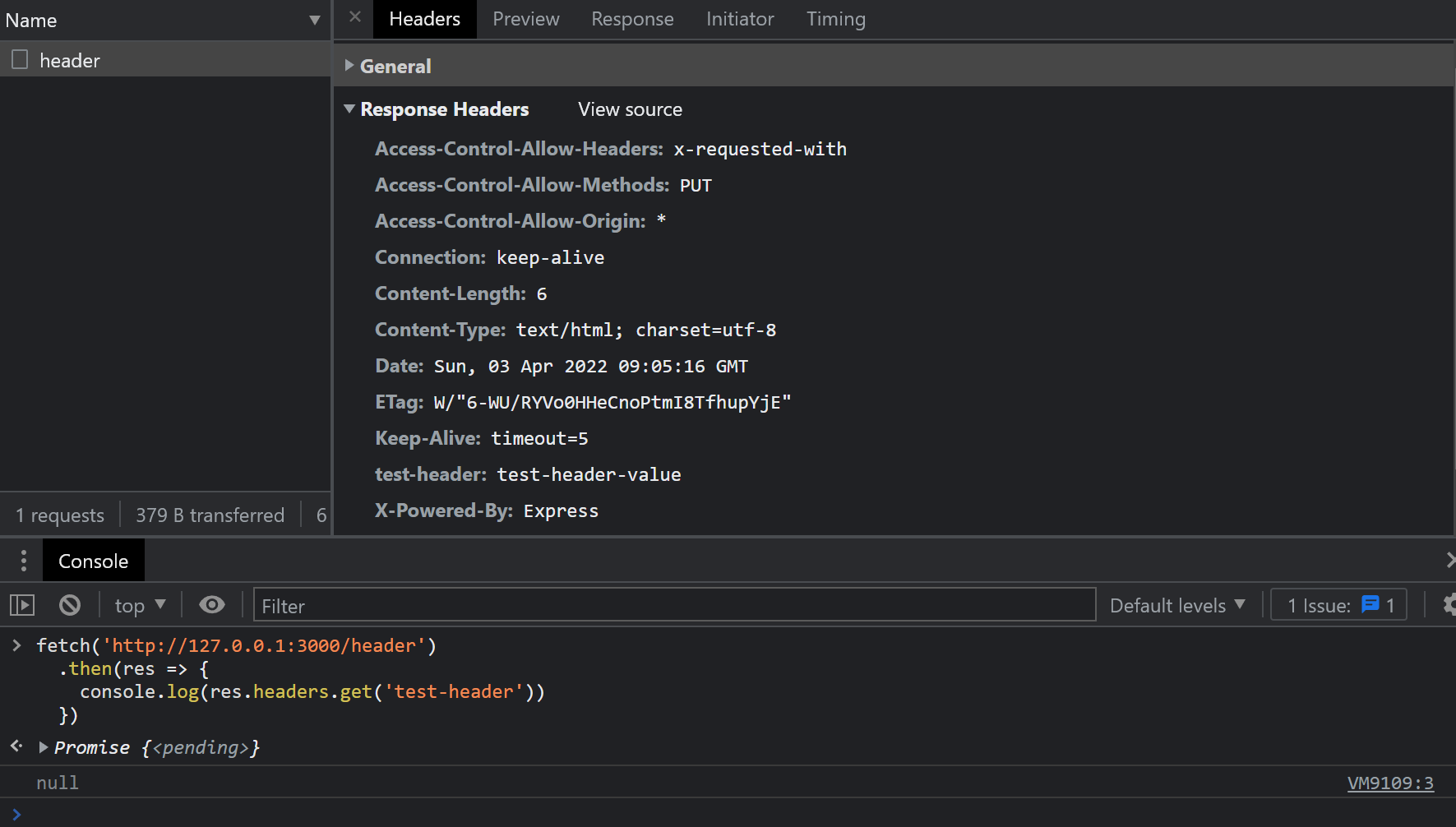 fetch('http://127.0.0.1:3000/header') .then(res => { console.log(res.headers.get('test-header')) })结果如图: